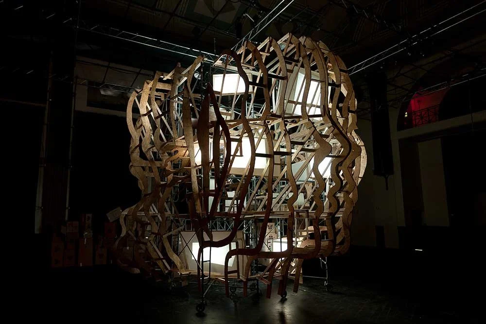 The single-channel video, video installation and photographs are the artists’ meta-exploration of the process of collaborating with a writer, composer, actors and stage crew while developing and rehearsing this work for a live performance in an old bank building. In the video an actor leaves the bank’s vault and walks slowly through the chaos of the real-life, slightly staged, rehearsal. She steps inside the moving set, which is modeled after her own head, and climbs to the top to adjust a spotlight until it illuminates her to the point of obscurity.