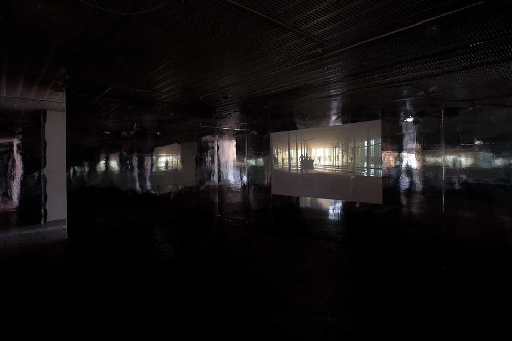 In an abandoned industrial mill building in Central Falls, Rhode Island, the birthplace of the American Industrial Revolution, a stage constructed of wood and mylar becomes a lake. Surrounded by potted plants, the set for the video and photograph evokes an invented world where performers alter the lake's structure to fabricate an eclipse of the sun.