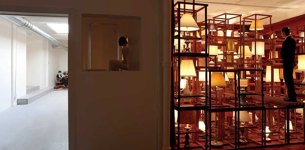 The set for the video is loosely organized around Carlo Crivelli’s The Annunciation of St Emidis, 1480. The “annunciation” in the painting is depicted as a ray of light that originates in the clouds and cuts a diagonal line through a small window in a building, through a dove with a golden halo, and stops at a woman’s head. In the video, a “light” is picked up by a preacher-like performer and passed through a window into a white space, where a woman moves it to a second window, and delivers it to a couple who are deep in conversation.