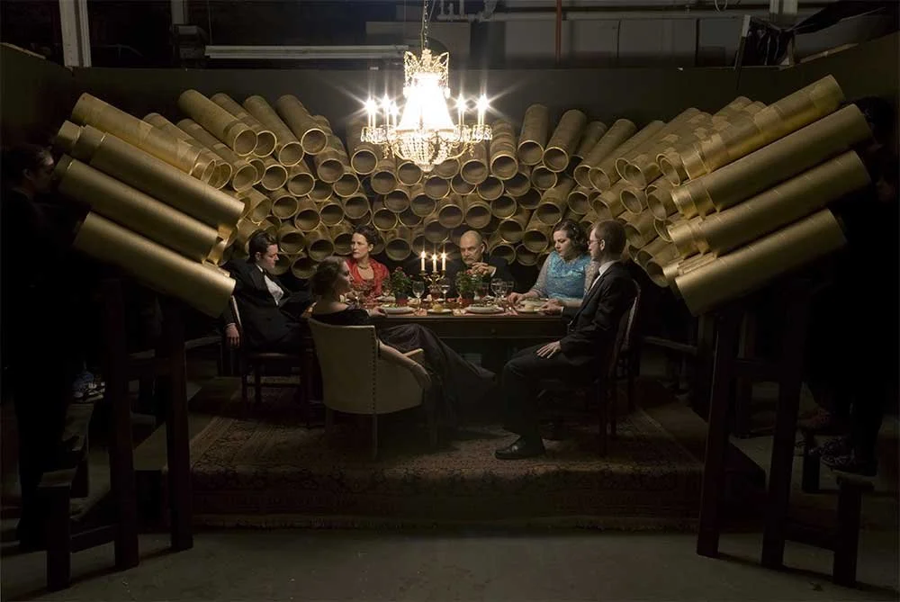 The Listening Array is a term that refers to a series of microphones that correlate data to determine position. In the symbolism of baroque art, saints were identified by a golden halo, or nimbus, surrounding them. In both the video and photograph for The Listening Array, a group of six individuals sit at a formal dinner table, surrounded by an array of golden pipes. At the end of each pipe, an ordinary person stands listening. Whether they are venerating those seated at the table or gathering information to undermine their efforts is up for grabs. The soundtrack is the Russian funeral march, Вы жертвою пали (You Fell Victims) [1878].