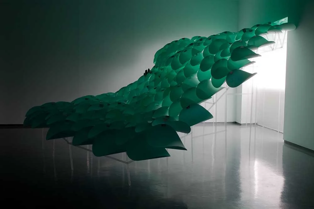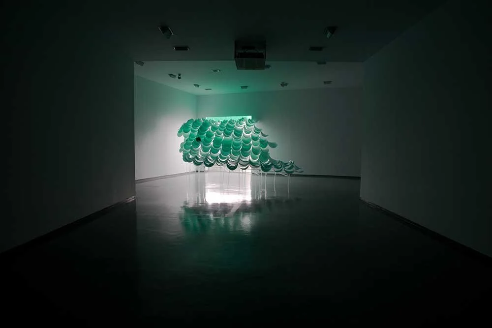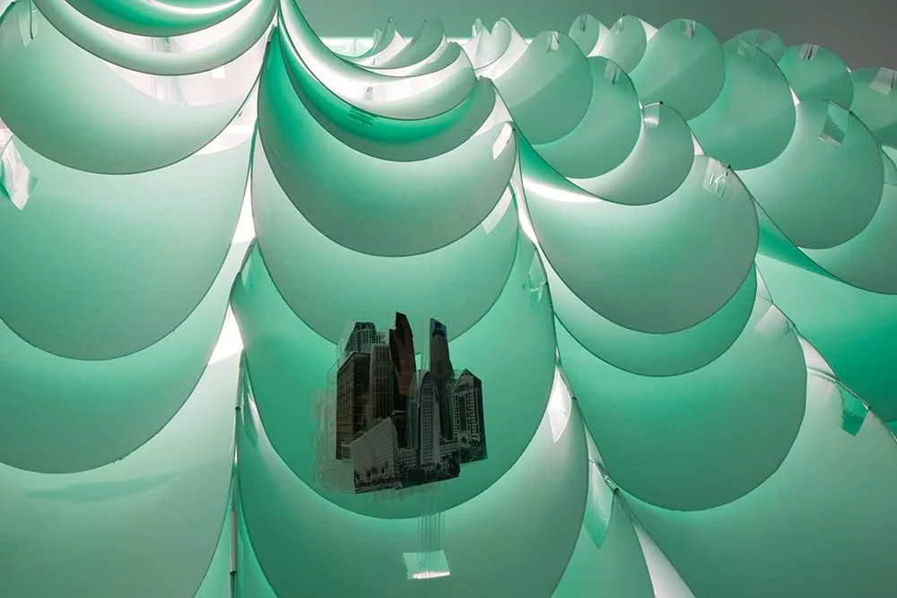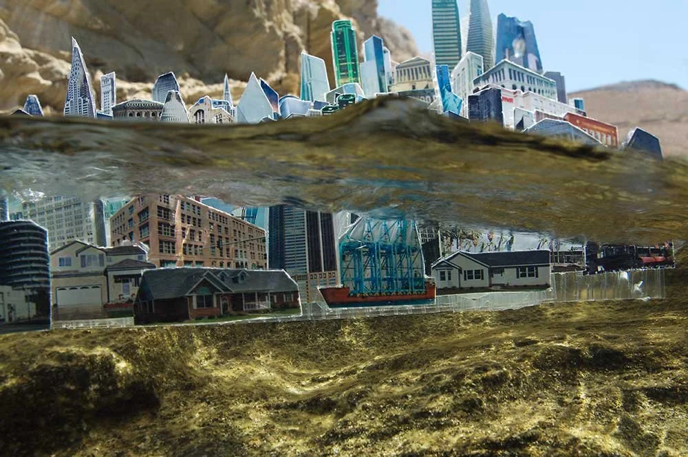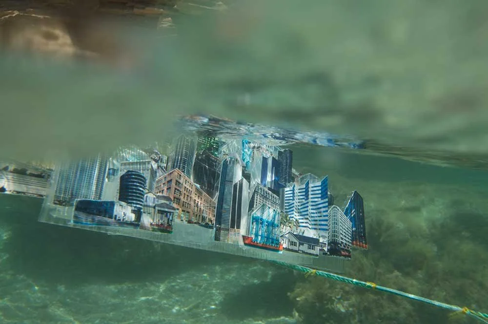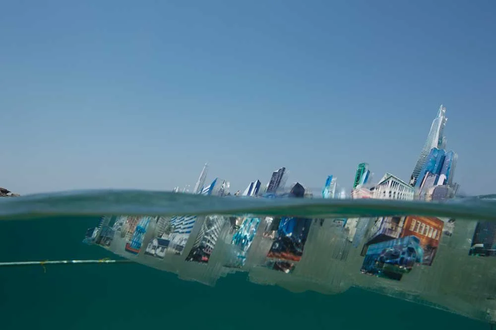 Filmed underwater off the Greek island of Tzia, The Oldest Song We Know features a model — consisting of buildings from every major American city — sinking in the sea. Six people in white pull the sunken city on a fishing line through the Aegean.
